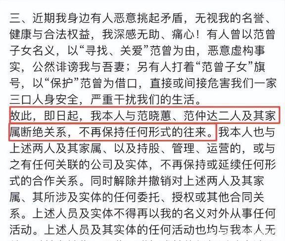 范曾在声明的第三条中,明确指出:【继子范仲达和女儿范晓蕙联手挑起矛盾,恶意虚构事实,公然诽谤徐萌】。他们以“范曾子女”的名义,打着“保护范曾”的口号,直接或间接伤害他和徐萌,严重干扰了他们的生活。所以,范曾发话了,从今往后他跟范仲达、范晓蕙,还有他们的家人完全断绝关系,不会再有任何联系。