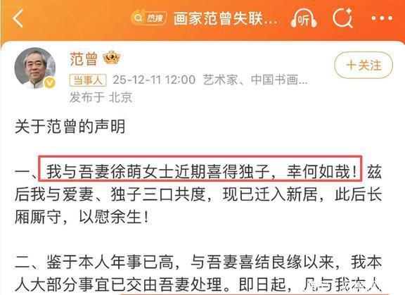 11日中午12点,范曾又在网上发帖,回应之前的那些风波。范曾在声明中先是自曝,【我和爱妻徐萌近期喜得独子,日后三口将在新居内长相厮守】。八月中旬,87岁的书画大师范曾被他的娇妻卷去了20亿,这个新闻真是火到不行,人人都在讨论。没想到啊,就四个多月,事情竟然发生了这么大的变化。