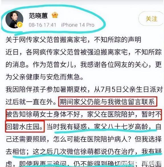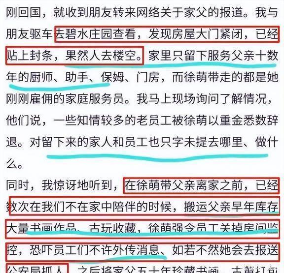 从第三条声明中可以看出,8月份网传的“徐萌给范曾设局”、“徐萌软禁范曾”、“徐萌转移20亿财务”等言论,都是范晓蕙和范仲达搞出来的。其实范曾的那些传闻,最开始就是范晓蕙那边放出来的。范晓蕙在网上说她爸爸失踪了,还提到徐萌带着人把家里几十年积攒的宝贝都搬光了,价值竟然有20亿呢。